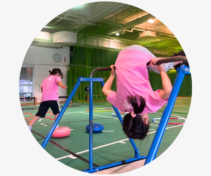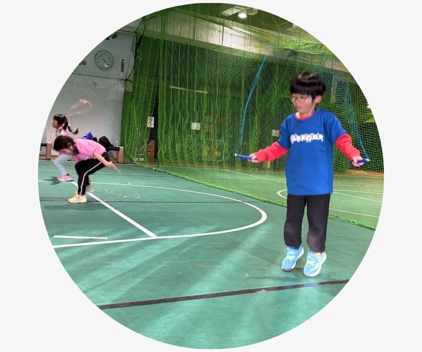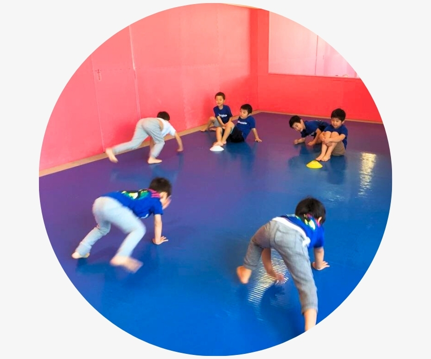 運動の土台となる基礎動作(走る・跳ぶ・転がる・這う)と、学校体育(マット運動・鉄棒・縄跳び)を中心に習得を目指します。